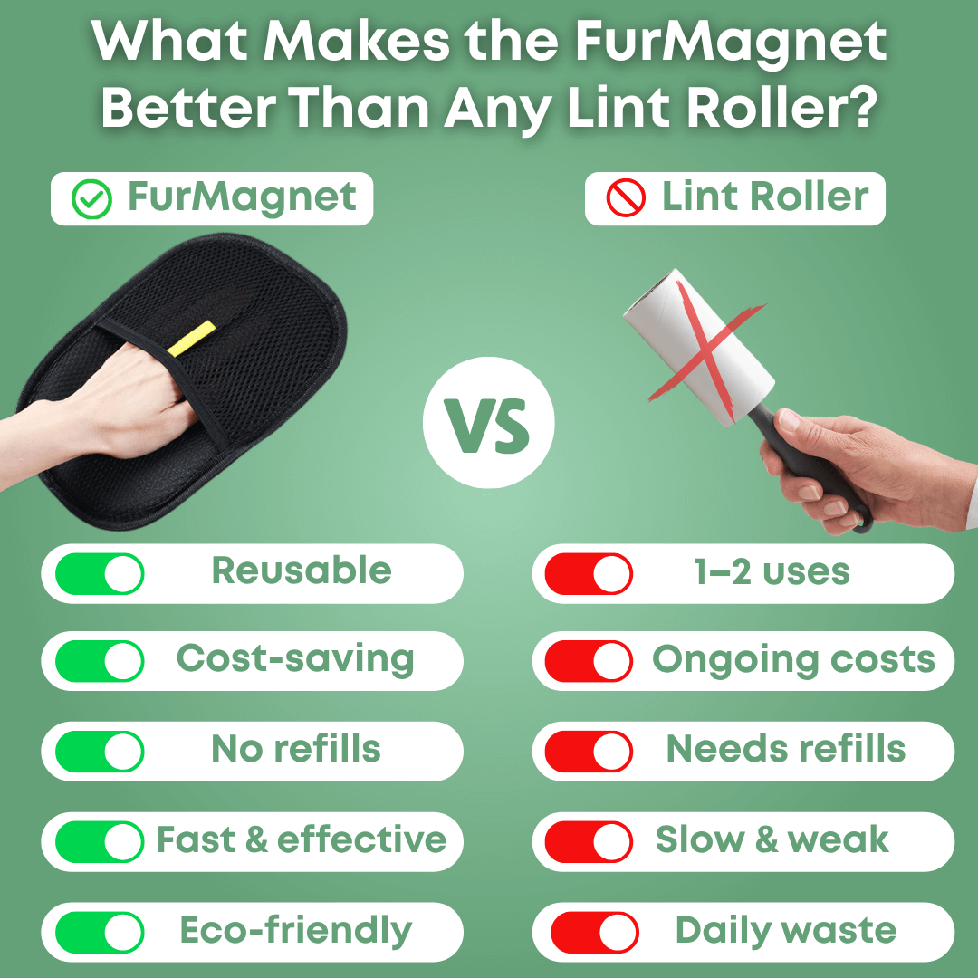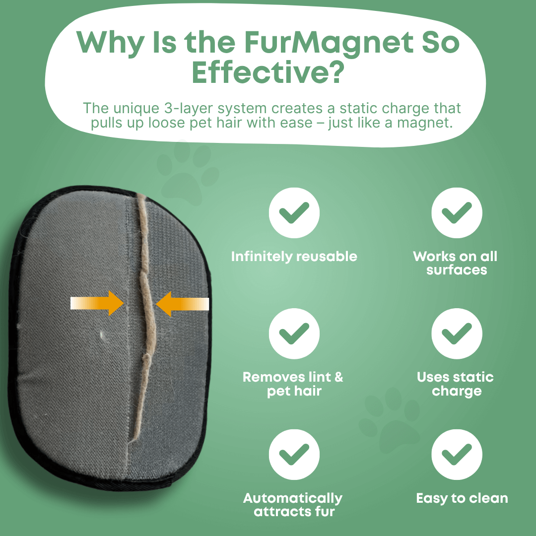 Tired of pet hair on your clothes, sofa or carpets? The FurMagnet glove removes loose hair in seconds – no hassle, no waste. Its unique static-charge technology attracts fur like a magnet and lifts it right off any surface.